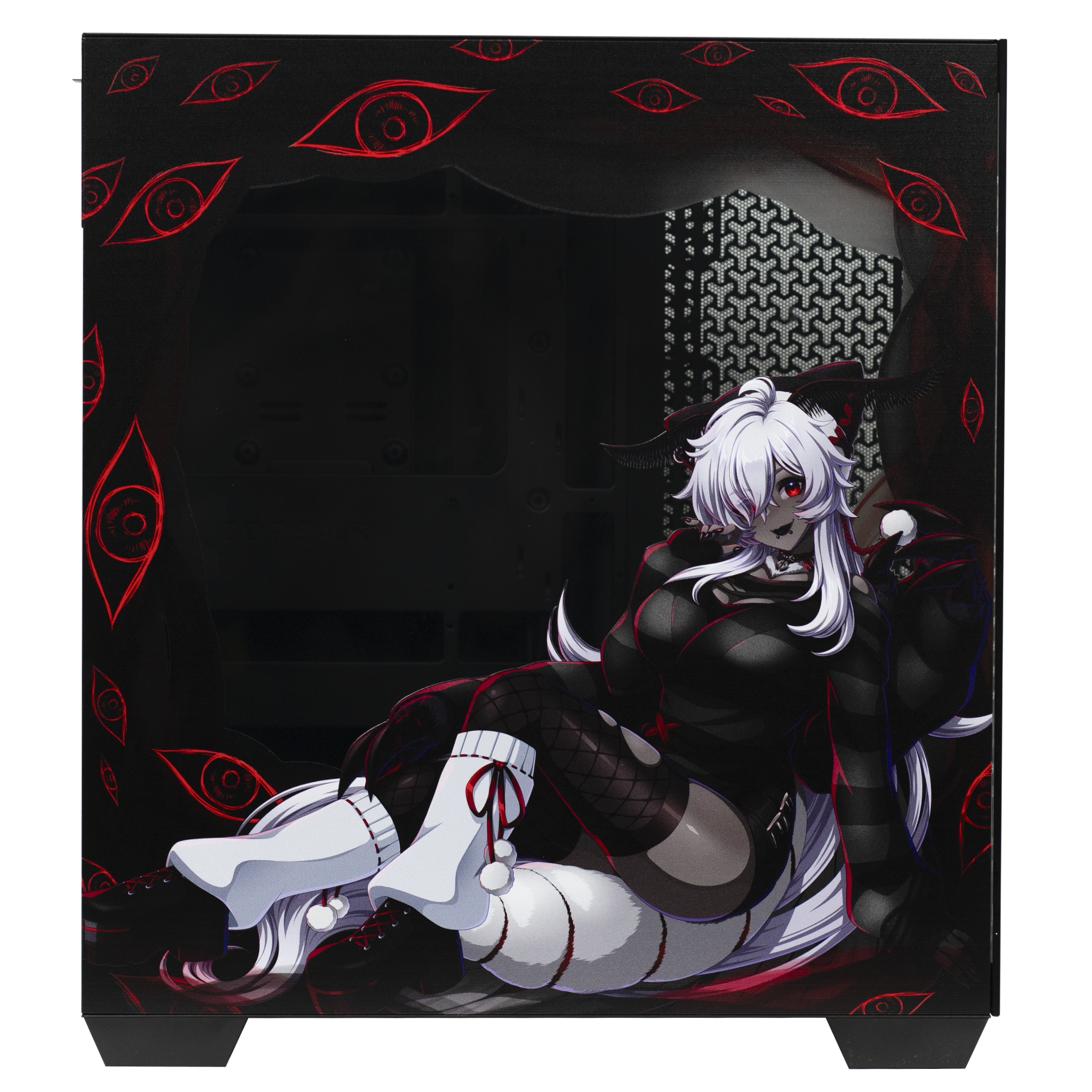 Step into the cryptid twilight of FenariMori’s realm with this exclusive collaboration PC case, designed as a tribute to her eerie charm and signature moth-inspired aesthetic. Wrapped in deep reds and shadowed blacks, the case features FenariMori seated in her iconic mysterious pose, framed by watchful eyes and occult patterns that echo her cryptid roots. Her adorable moth companion brightens the opposite panel, adding a playful contrast to the case’s haunting elegance.