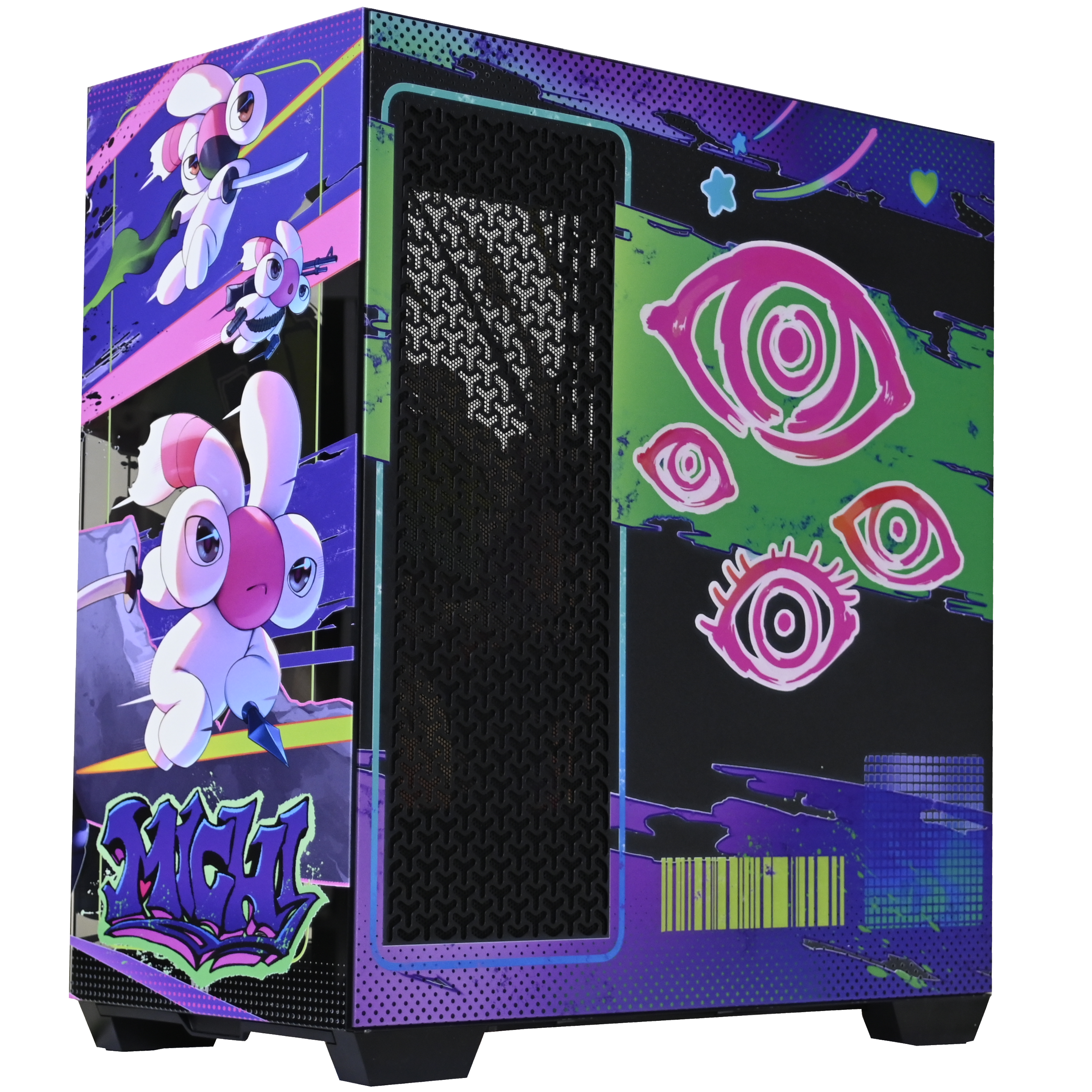 Enter the stitched-up world of Michi Mochievee, in this exclusive collaboration. This limited-edition PC case is wrapped in full-body custom artwork featuring Michi Mochievee and her hauntingly adorable sidekick Jared, brought to life in vibrant, high-res detail.