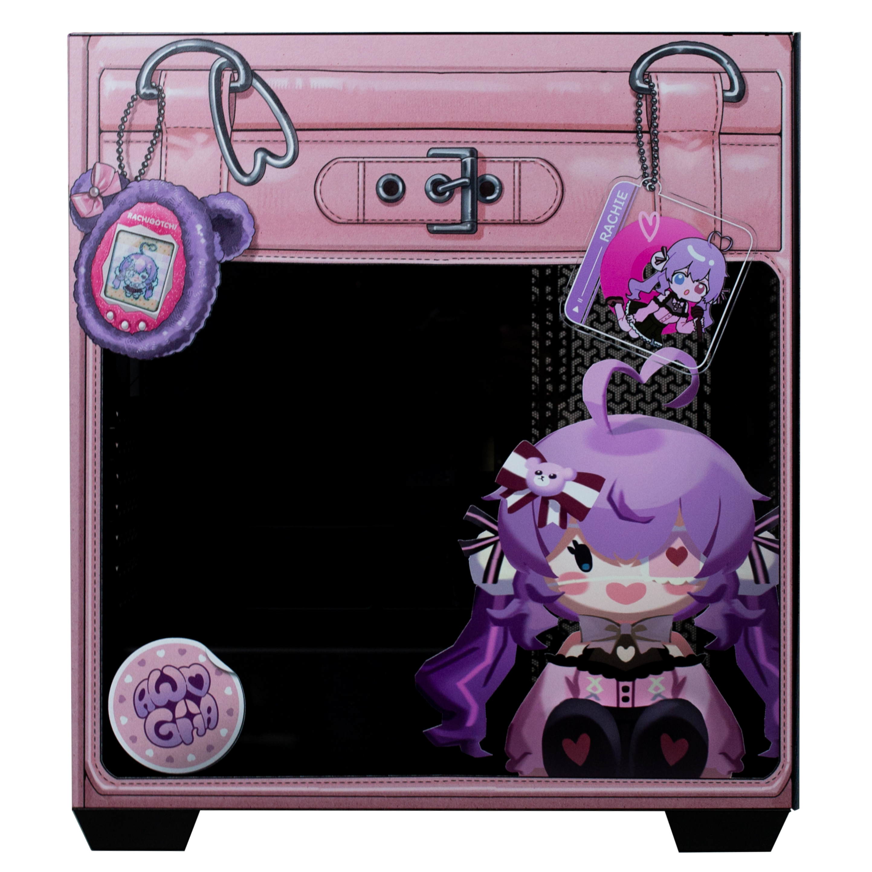 Step into the pastel charm of Rachie's world with this exclusive collaboration PC case, a heartfelt tribute to her playful aesthetic and signature pink flair. Designed to resemble a stylish Ita-bag, this case wraps your setup in ribbons, buttons, and collectible-style pins featuring Rachie and her plushie companion.
